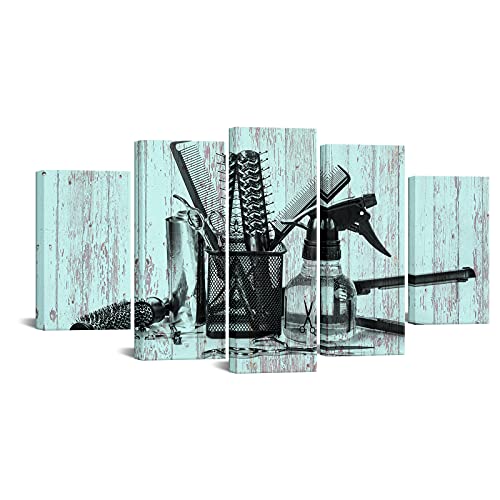 🔥 Crazy Deals Nachic Wall - Large 5 Piece Canvas Wall Art Barber Shop Hairdressing Tools with Teal Wood Background Picture Poster for Bedroom Hair Salon Decoration Stretched and Framed Ready Hanging on
